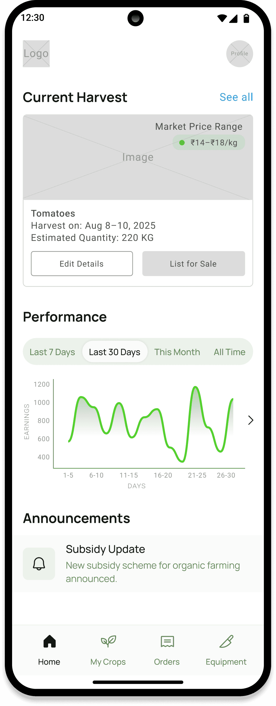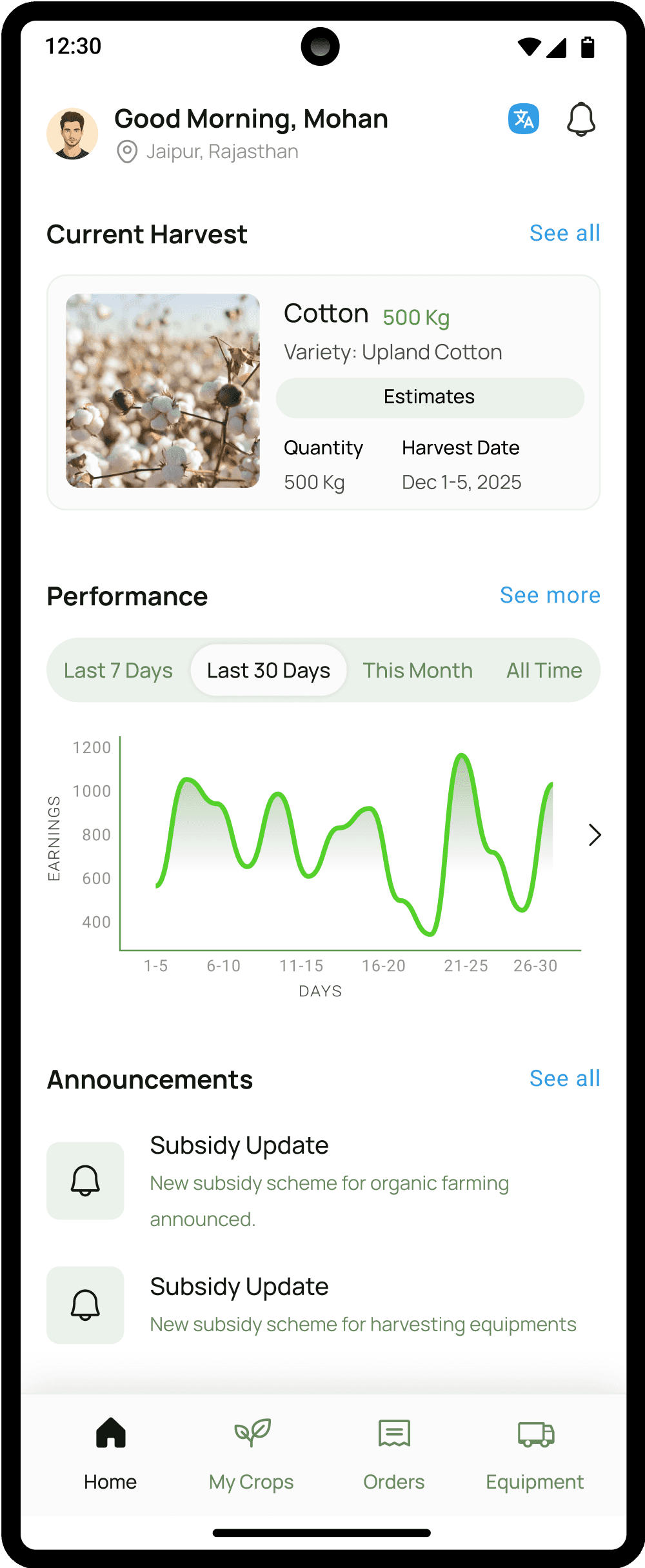 Farmer Portal: Crop listing, subsidy info, equipment access, and crop market range information.