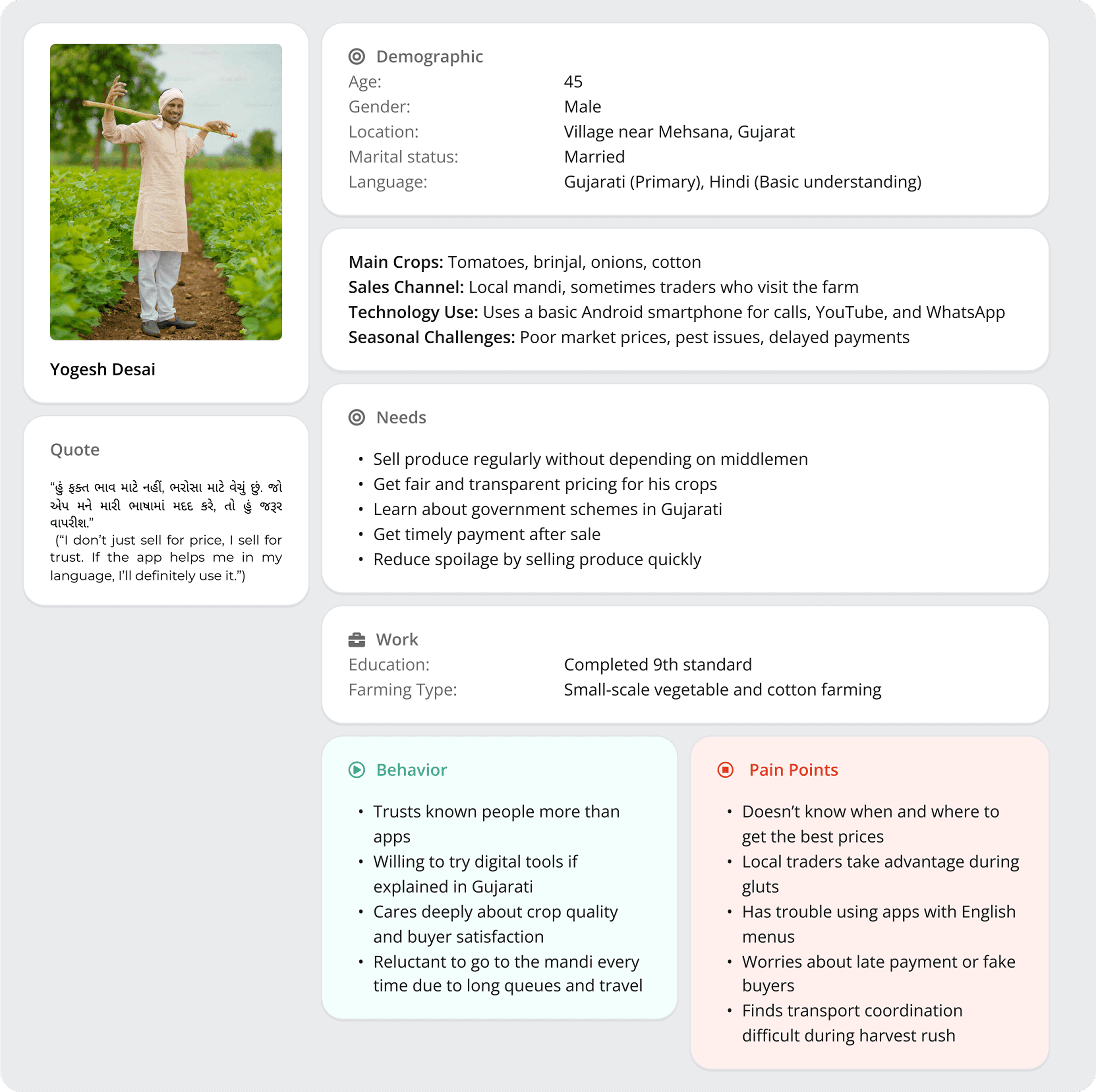 "Through this project, we learned how important it is to listen to real users before designing. Talking to farmers helped us understand their daily struggles. We saw how small design choices - like using clear words, big buttons, and local languages - can make a big difference. We also learned how to keep things simple so the app works well even in low internet areas. Working as a team taught us how to share ideas and solve problems together."